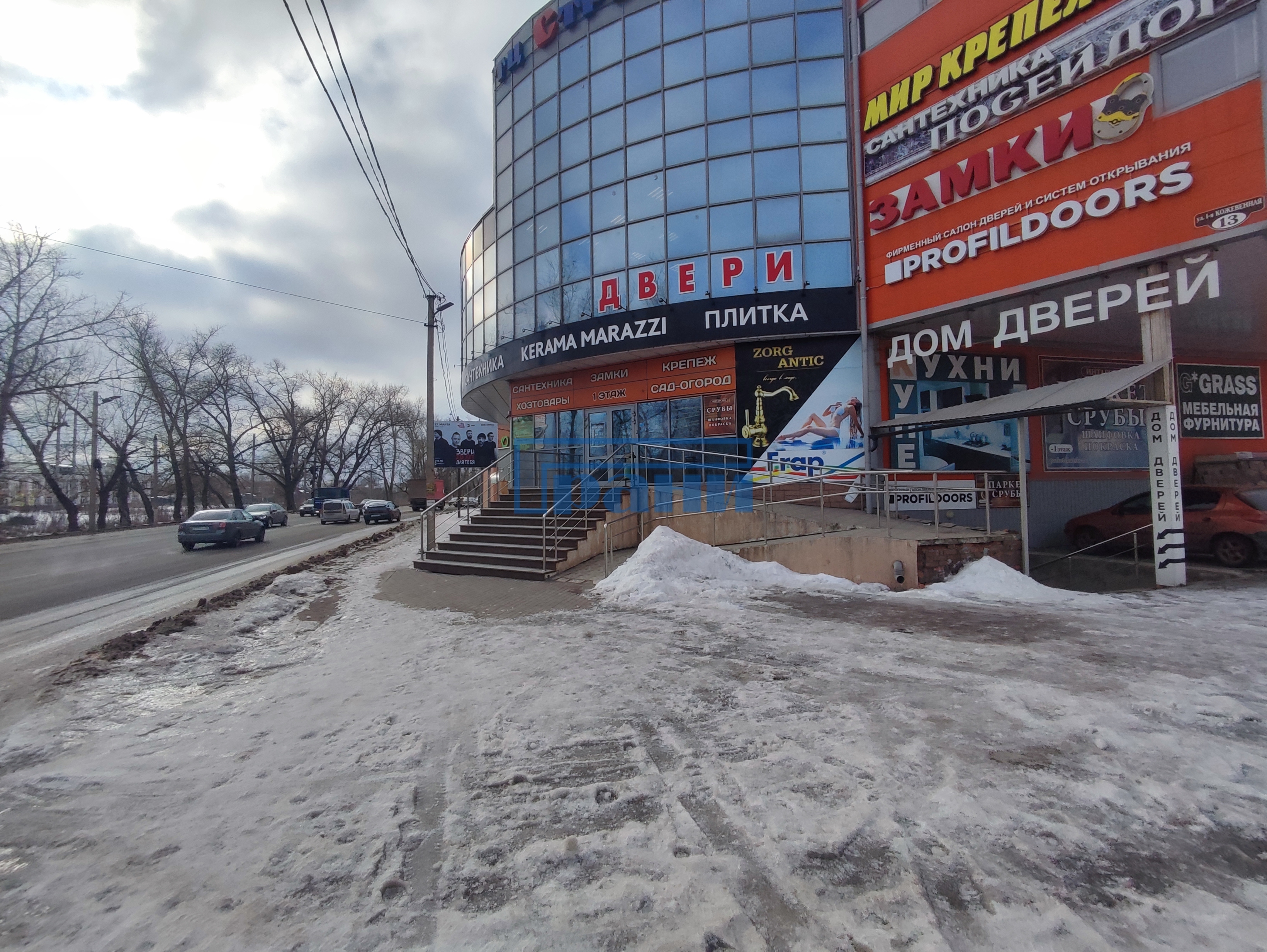 Здание ТЦ расположено вдоль дороги на видном месте;